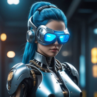 The image features a female character with blue hair styled in bangs and a side fringe. She has robotic-looking eyes, suggesting she is an android or part of science fiction. Her skin appears to be human-like, but her facial features are distinctly robotic. The character is wearing futuristic armor that includes a chest plate with intricate patterns and mechanical details, indicating advanced technology. The right side of her head is visible and shows what seems to be a communication or control interface, possibly for her armor's functions. She has a prominent collar with glowing blue circuitry, which stands out against the metallic grey of her armor. The background suggests an industrial setting, possibly a spacecraft or a laboratory, given the presence of what appears to be technological equipment. The overall style of the image is realistic and detailed, suggesting that it could be from a video game or a CGI rendered artwork intended to depict a futuristic scenario.