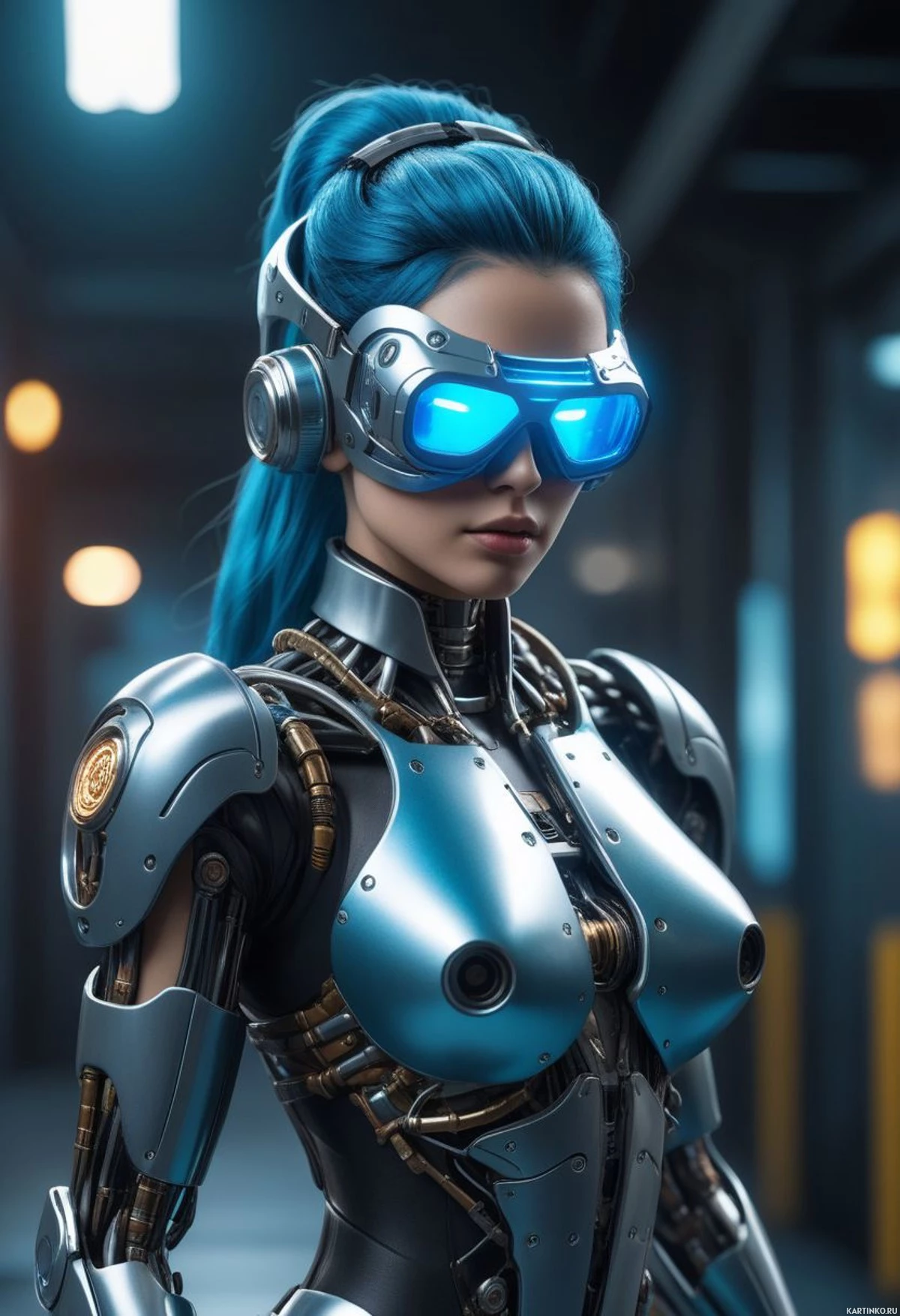 На картинке изображена девушка с голубыми волосами, уложенными челкой и боковым пробором. У нее роботизированные глаза, что намекает на ее андроидной природе или принадлежность к научной фантастике. Кожа выглядит как человеческая, но черты лица явно механические. На ней футуристическая броня с нагрудником, украшенным сложными узорами и механическими деталями, что говорит о передовых технологиях. Правая сторона ее головы видна и показывает, похоже, коммуникационный или управляющий интерфейс, возможно, для функций брони. У нее выделяющийся воротник со светящейся голубой электросхемой, резко контрастирующий с металлическим серым цветом брони. Фон предполагает промышленную обстановку, возможно, космический корабль или лабораторию, судя по наличию технологического оборудования. В целом, стиль картинки реалистичный и детализированный, что указывает на то, что она могла быть взята из видеоигры или создана с помощью CGI для изображения футуристического сценария.