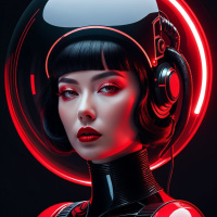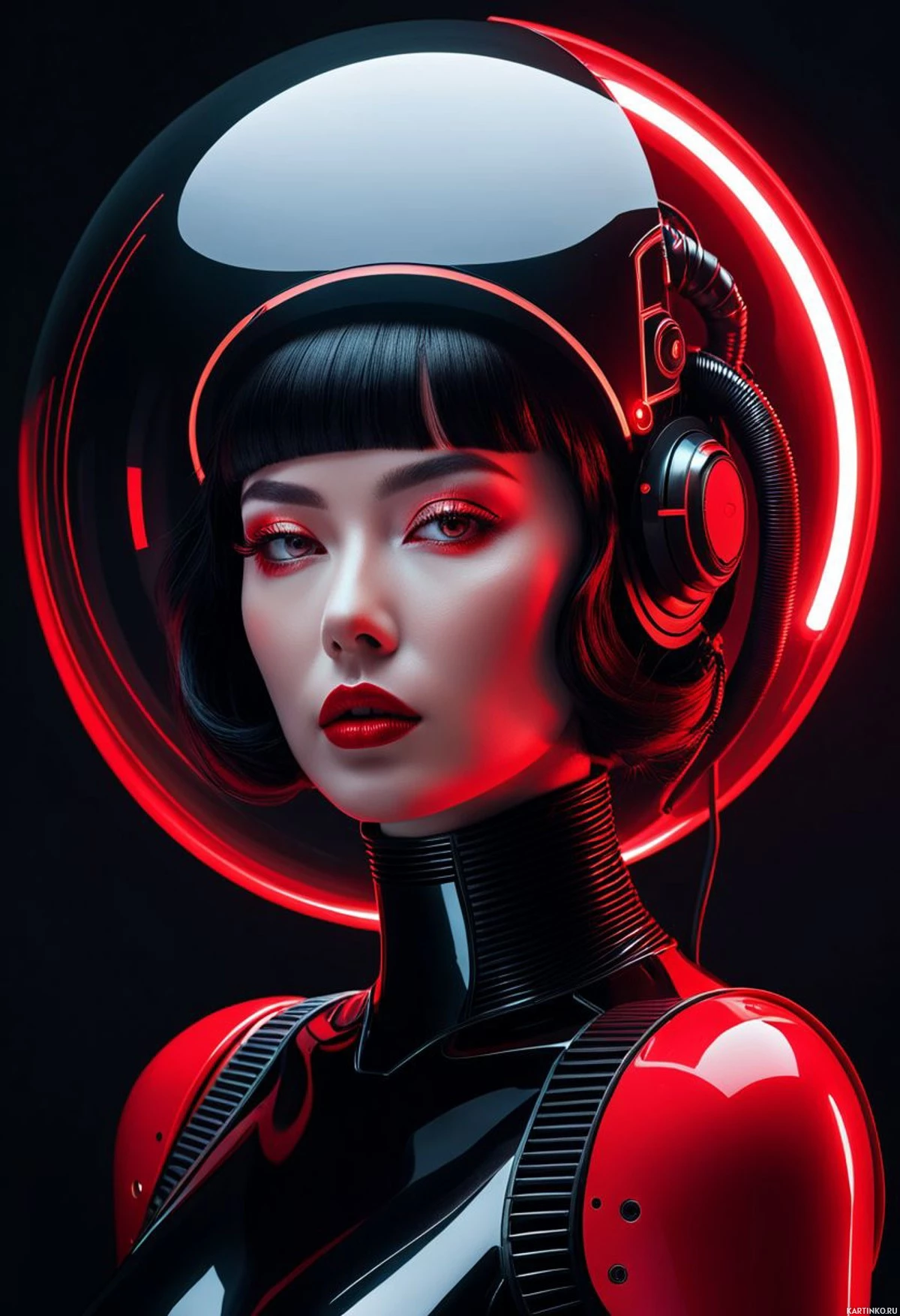 На картинке изображена женщина в шлеме, из-за которого виден красный круг, словно исходящий от её головы. Шлем чёрный, с белой маской и наушниками, прикреплёнными сбоку. Её стиль напоминает научно-фантастический, с тёмными тенями на глазах и яркой красной помадой, контрастирующей с цветом кожи. Волосы коротко подстрижены и прилижены к шлему. Выражение лица спокойное и направлено на зрителя.
