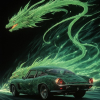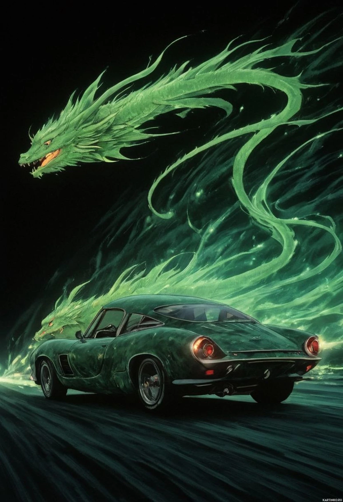На картинке изображён зелёный дракон со светящимися глазами, в агрессивной позе, с открытой пастью, словно рычащий или готовящийся к нападению. За драконом – яркий зелёный свет, как будто исходящий от него, усиливающий его устрашающий вид. Перед драконом – винтажный автомобиль, конкретно Ford Mustang, который, кажется, движется навстречу дракону, с включёнными фарами и клубами выхлопного дыма, вырывающимися из-под капота. Дизайн автомобиля указывает на то, что он мог быть выпущен в 1960-е или 1970-е годы. Действие происходит ночью, судя по темноте позади дракона и автомобиля, которые освещены светом дракона и фарами машины. Картинка обладает динамичной, энергичной атмосферой и, похоже, вдохновлена темами фэнтези или научной фантастики. Стиль работы напоминает обложку для музыкального альбома или общую эстетику рока, благодаря своей смелости, графичности и драматизму.