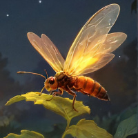 На картинке изображено художественное представление стрекозы, сидящей на растении ночью. У стрекозы большие, полупрозрачные крылья с голубыми и зелёными оттенками, подчёркивающими их структуру. Тело сочетает в себе жёлтые и чёрные цвета, что типично для многих стрекоз. Голова и грудь ярко окрашены в красные и оранжевые тона, а от головы отходят усики. На заднем плане – звёздное небо с несколькими видимыми созвездиями, создающими ощущение тёмной и спокойной обстановки. Земля покрыта пышной зеленью, а от растения, на котором сидит стрекоза, исходит мягкое свечение, которое может быть результатом биолюминесценции или просто художественным приёмом для усиления сказочной атмосферы сцены.
