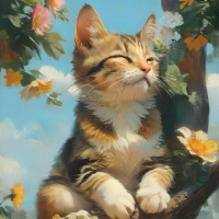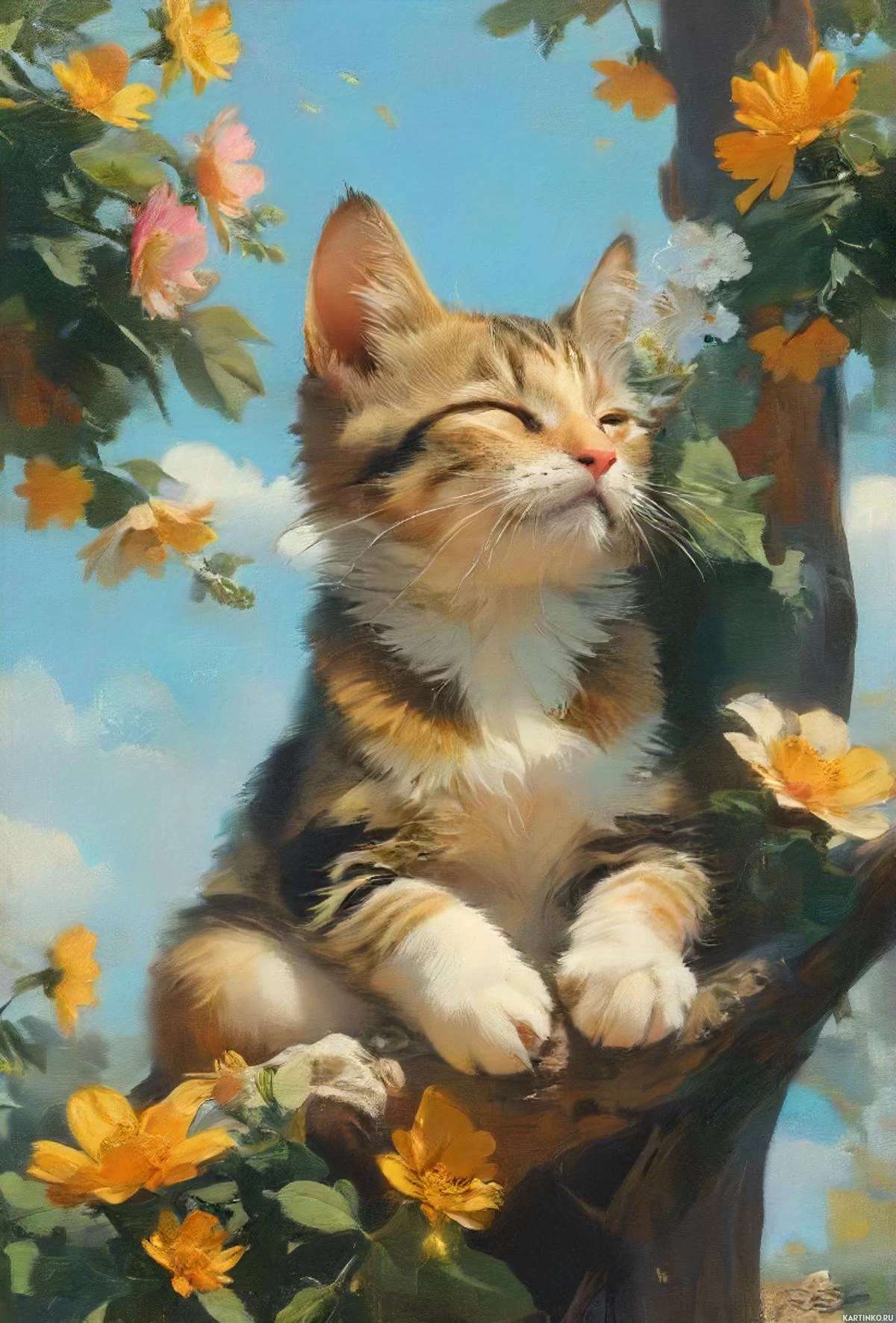 На картинке – черепаховый кот с характерными черными полосками на мордочке и ушах, примостился на ветке дерева, украшенной желтыми цветами. Кот смотрит вверх с легкой улыбкой, будто наблюдает за чем-то в небе или просто наслаждается днем. По всей картинке разбросаны маленькие белые цветы, добавляя ощущение природной красоты и спокойствия. Фон ясный и голубой, что говорит о ярком, солнечном дне. Общее настроение картинки – умиротворение и довольство.