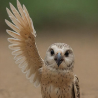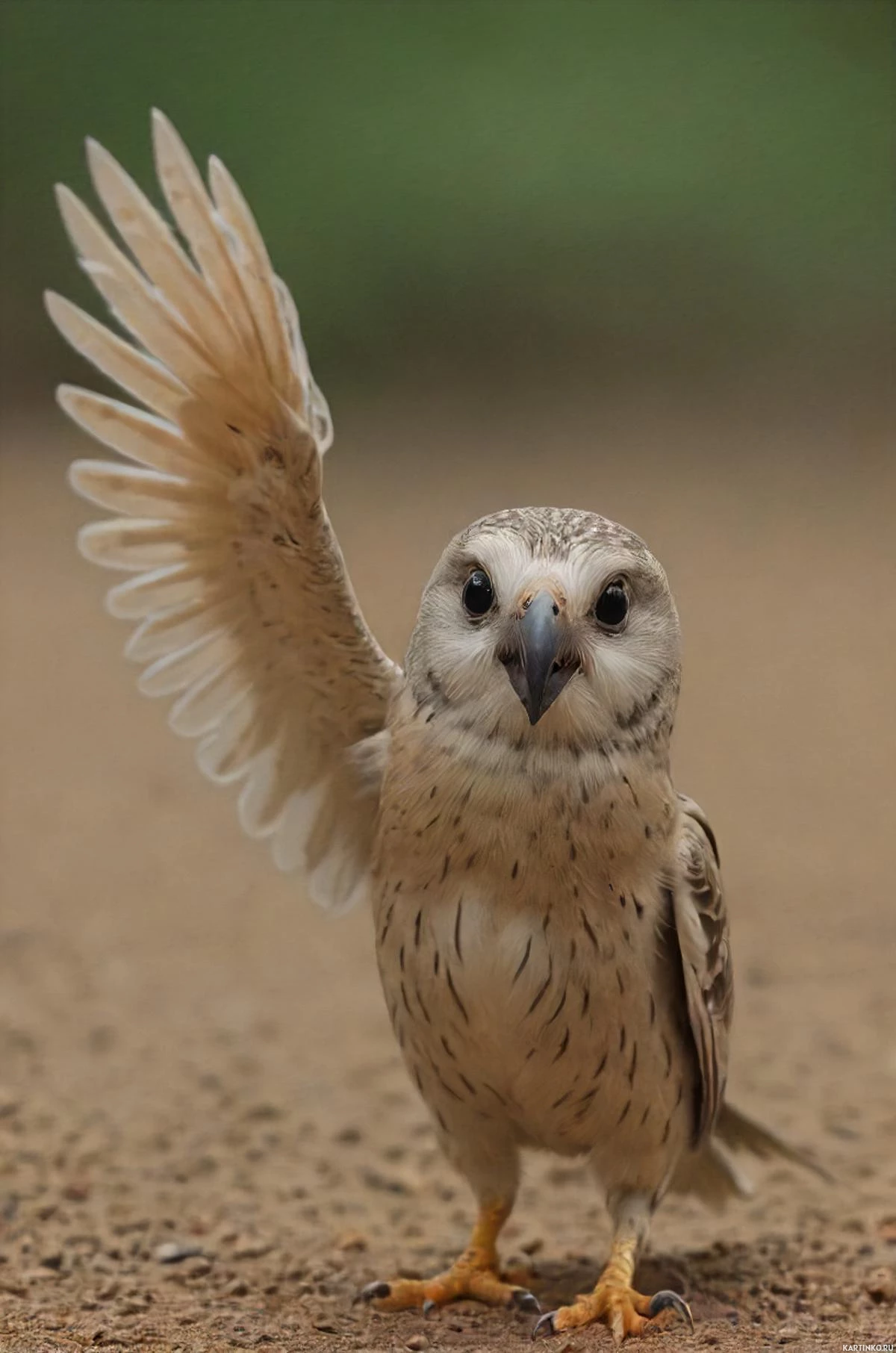 На картинке изображена маленькая сова, стоящая на тропинке или грунтовой поверхности. Крылья у нее широко распахнуты, возможно, она готовится взлететь или выражает волнение. Перья окрашены в коричневые и белые тона, что характерно для некоторых видов сов, например, для домовых. Фон размыт, но по всей видимости, это открытая местность.