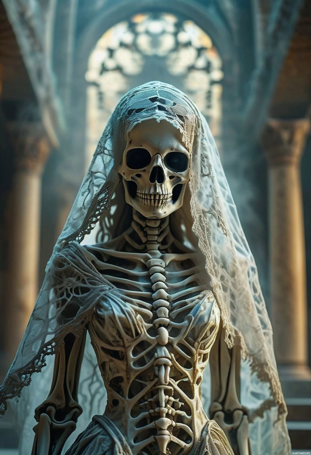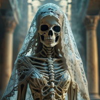 На картинке изображена скелетированная фигура в свадебном наряде, стоящая в роскошном архитектурном окружении, напоминающем собор или церковь. На фигуре свадебный фату, а на голове и плечах декоративные элементы, намекающие на традиционные свадебные аксессуары, например, цветы или украшения. Торс скелета открыт, демонстрируя структуру ребер, характерную для человеческой анатомии, а на руках – сложные узоры. Задний план включает арочные проемы и колонны с резным каменным декором, что указывает на историческую или фэнтезийную тематику.