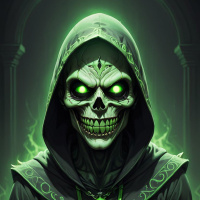 The image depicts a stylized illustration of a figure that resembles a skull wearing a hooded cloak. The hood is draped over the top part of the skull, obscuring its eyes and creating an air of mystery or intrigue. The overall color scheme is dark with green accents highlighting certain features such as the eyes, which are glowing brightly within the empty sockets, adding a supernatural or ominous touch to the figure's appearance. The cloak is detailed with what appears to be runes or symbols that give it an arcane or magical look. The figure stands in front of what seems to be a dark archway, suggesting a connection to some mystical or shadowy realm. The background is monochromatic and somewhat obscured by the hooded figure, but there's a hint of architectural detail that could imply an ancient or occult setting. The image is rich in symbolism commonly associated with themes of death, the supernatural, and dark fantasy genres. The presence of the hood and the skull's glowing eyes contribute to a sense of otherworldly power or mystery.