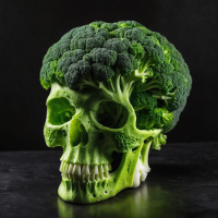 Картинка изображает череп, созданный из брокколи и выложенный в форме человеческой головы. Соцветия брокколи тщательно расположены, чтобы имитировать черты лица, такие как глаза, нос и зубы. Череп лежит на поверхности, похожей на столешницу с мраморным узором.