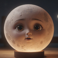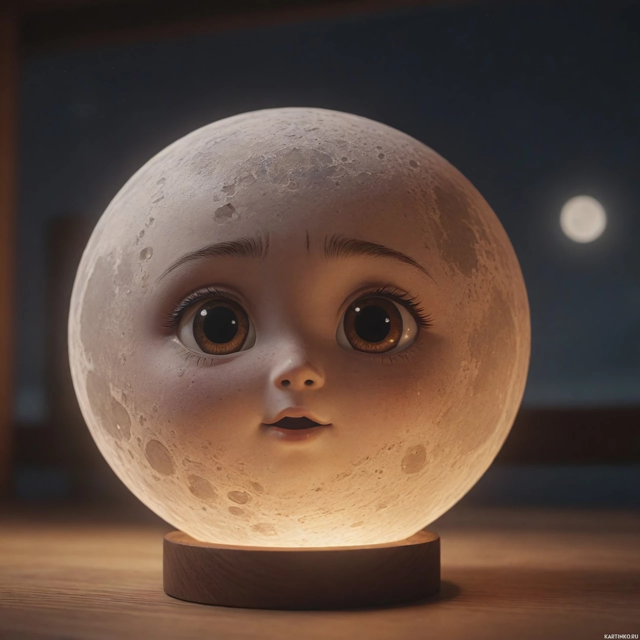На картинке показана голова куклы, креативно объединенная с иллюстрацией луны, создавая иллюзию лунного лица. У куклы большие темные глаза, короткие реснички, нос и губы, изображенные в розовых тонах. Её волосы представлены нитями или линиями, напоминающими тонкие линии или трещины на поверхности луны. Луна сама по себе проиллюстрирована кратерами и более темными участками, имитирующими тени или глубину кратеров. Кукла установлена на небольшую подставку, вероятно, деревянную. На заднем плане – интерьер с теплым освещением, исходящим, судя по всему, от лампы слева, создающей мягкое сияние над сценой. Стиль картинки сочетает реалистичные элементы, такие как лицо куклы и лунные кратеры, с более стилизованными художественными элементами, например, представление волос на луне. В целом, эффект – причудливый и воображаемый, объединяющий неодушевленный предмет с небесным телом для создания уникального произведения искусства или декора.