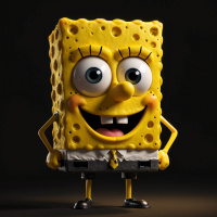 The image features a three-dimensional representation of SpongeBob SquarePants from the animated movie series. The character is depicted with a cheerful expression, displaying his iconic smile and wide eyes. His attire consists of a yellow pair of square pants with a black belt and white shoes. SpongeBob's arms are resting at his sides, and he appears to be standing confidently. The background is dark, which contrasts with the bright yellow of SpongeBob's body.