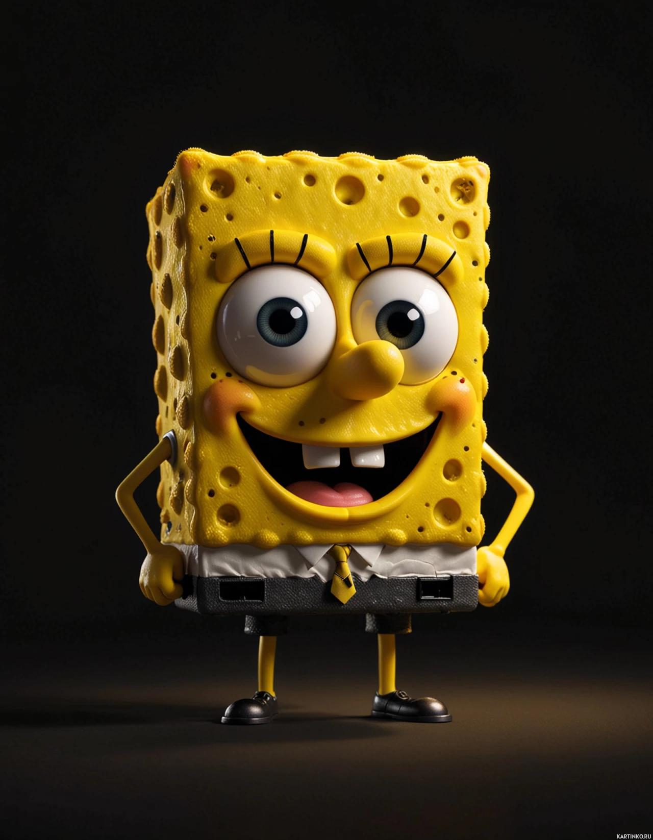 На картинке изображен объемный Спанч Боб из мультсериала. У персонажа жизнерадостное выражение лица: широкая улыбка и большие глаза. На нем желтые квадратные штаны с черным ремнем и белые туфли. Руки Спанч Боба опущены вдоль тела, он выглядит уверенно. Фон темный, что создает контраст с ярким желтым цветом его тела.