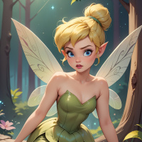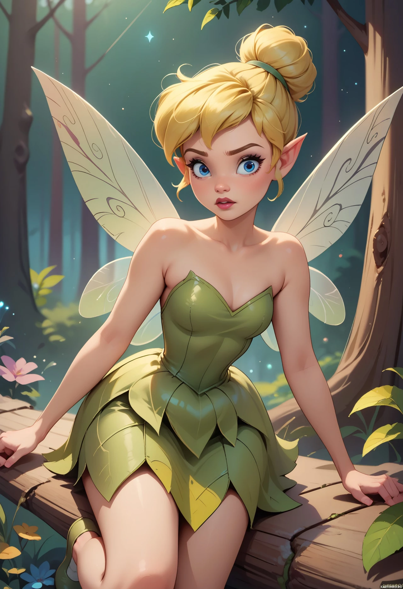 На картинке изображена фея с чертами, напоминающими Тинкер Белл. У неё светлые волосы, уложенные в высокую причёску, и она одета в зелёное платье, похожее на костюм, который часто встречается у Тинкер Белл в мультфильмах. У феи заострённые уши, характерные для сказочных существ, а за спиной расправлены крылья. Она сидит на поваленном стволе или ветке, на фоне волшебного лесного пейзажа. Вокруг неё видны отголоски зелени, а на переднем плане заметны маленькие цветы. Картинка выполнена в фэнтезийной тематике и больше похожа на иллюстрацию, чем на фотографию, из-за своего стилизованного вида.