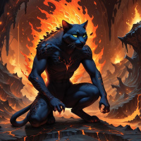 In this image, a fantasy-themed artwork depicts a powerful khajiit in a dramatic pose. The khajiit is crouched on a rocky surface, with smoke and flames swirling around it, suggesting an intense or fiery energy. It has sharp teeth and claws, hinting at its natural instincts for hunting and combat. The background features dark, menacing volcanic rock formations that contribute to the overall apocalyptic atmosphere of the piece.