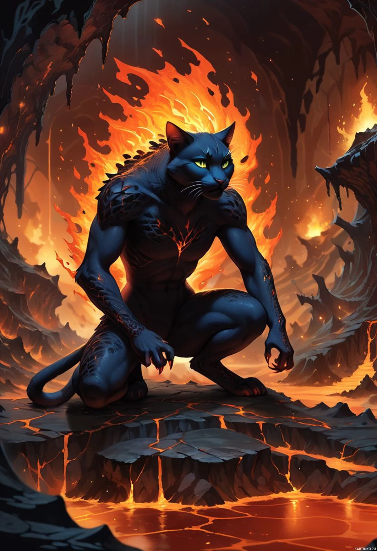 На этой картинке изображена фантастическая работа, на которой запечатлен могущественный хаджиит в эффектной позе. Хаджиит сгорбился на каменистой поверхности, вокруг него клубится дым и пламя, что создает ощущение сильной, огненной энергии. У него острые зубы и когти, намекающие на его природные инстинкты охотника и бойца. На заднем плане мрачные, угрожающие вулканические скалы, усиливающие апокалиптическую атмосферу всей картинки.