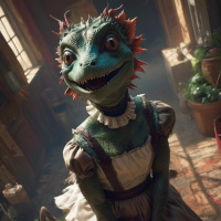 In the image, there is an anthropomorphic creature resembling a lizardman seated on the floor indoors. The creature has scales and a tail that are visible. It is wearing what appears to be historical or fantasy attire, with a blouse, skirt, and possibly a bodice or corset. The creature's skin color is greenish-brown, and it has large eyes and pointed ears. In the background, there are potted plants of various sizes and a wooden staircase leading upwards.