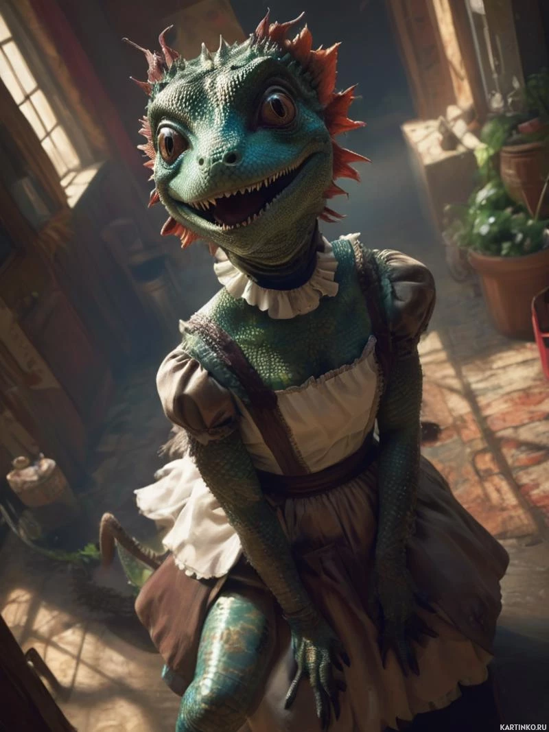 На картинке изображено антропоморфное существо, похожее на ящерочеловека, сидящее на полу в помещении. У существа заметны чешуя и хвост. Оно одето в одежду, напоминающую исторический или фэнтезийный костюм, включая блузку, юбку и, возможно, корсет. Кожа существа зеленовато-коричневая, с большими глазами и заостренными ушами. На заднем плане – горшки с растениями разных размеров и деревянная лестница, ведущая вверх.