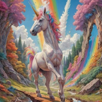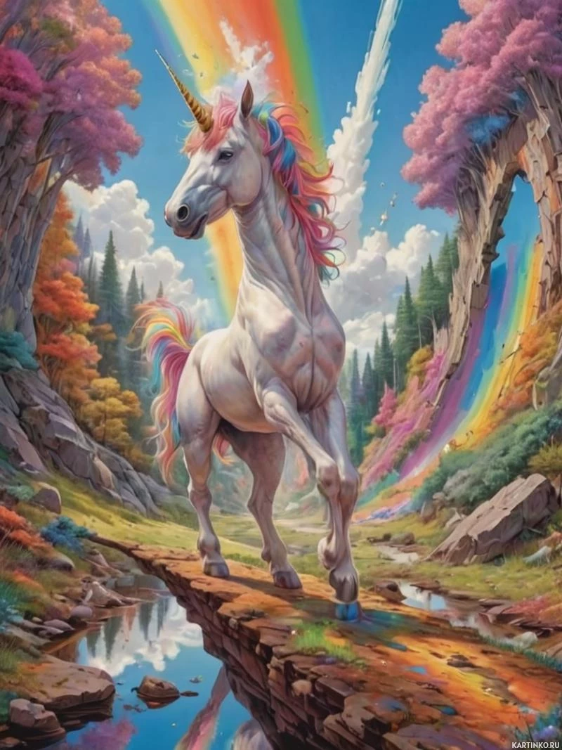 На картинке изображён величественный единорог, стоящий на каменном мосту. У единорога белоснежная шерсть и переливающийся радужный грива, играющая в лучах света. Кажется, он смотрит вдаль с выражением спокойствия. Задний план рисует яркую картину природы: деревья в оттенках зелёного и розового, создающие ощущение безмятежного и волшебного леса. Над ними – прекрасный радужный свод, добавляющий очарования атмосфере. Стиль рисунка тяготеет к реалистичному изображению, с вниманием к деталям, оживляющим сцену. Он передаёт суть фэнтези и притягательность единорогов в реалистичной манере, соединяя элементы реальности с ноткой волшебства.