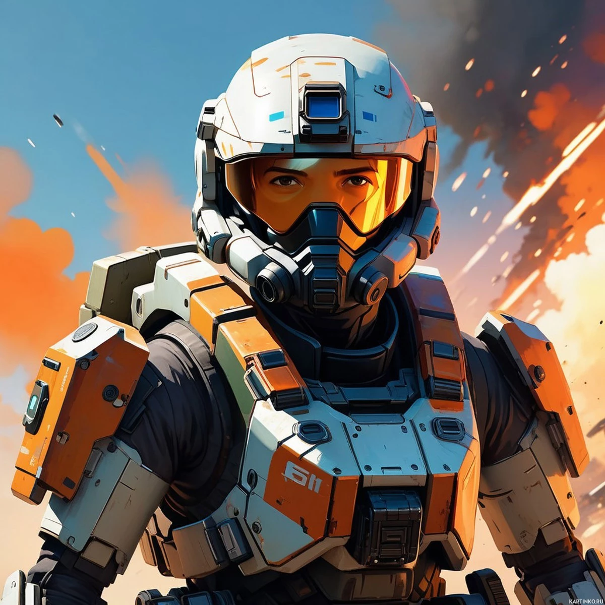 На картинке запечатлён персонаж в футуристических доспехах, выполненных преимущественно в оранжевых и белых тонах. Доспехи детализированы, с видимыми механическими элементами и панелями. На голове у персонажа шлем, скрывающий лицо, но открывающий глаза и рот. Над ним происходят взрывы, создающие ощущение экшн-сцены или сражения. На заднем плане – научно-фантастический пейзаж с горизонтом, усеянным небоскрёбами будущего.