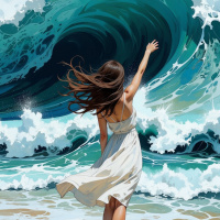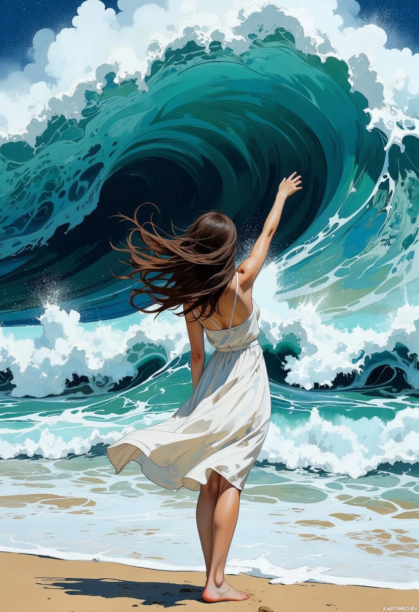 На картинке изображена женщина, стоящая на пляже у самой кромки воды. На ней светлое платье, а руки подняты вверх, словно она обнимает или тянется к чему-то за пределами кадра. Вода выглядит неспокойной, с белыми барашками пены, что говорит о разбивающихся рядом волнах. На заднем плане закручивается большая волна, указывая на морской пейзаж. Её волосы развеваются на ветру и ниспадают на спину, создавая динамичную и драматичную атмосферу. Цветовая гамма картинки яркая и насыщенная, что усиливает ощущение движения и энергии.