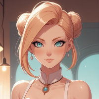 The image features a female character with blonde hair styled in twin tails and vibrant blue eyes. She has prominent pink lips and is wearing a metallic-looking silver top with shoulder guards, accented with gold detailing. There are also additional decorative elements on her outfit, including what appear to be crystals or gems attached to the fabric. Her gaze is directed slightly off to the side, and she has a neutral expression. The background suggests an indoor setting, possibly a room in a fantasy setting given the style of the character's attire.