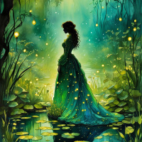 На картинке изображена девушка, стоящая перед лесом с прогалиной. На ней длинное, струящееся платье, напоминающее силуэт русалки. К зрителю она стоит спиной, будто смотрит на кого-то или что-то за кадром. Освещение говорит о том, что это может быть рассвет или закат, судя по мягкому свечению и длинным теням, падающим на ее платье. В лесу деревья увиты лианами, а на переднем плане видны лужи, в которых отражается окружающий пейзаж. Вся общая атмосфера — спокойная и волшебная.