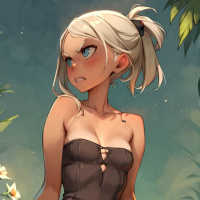 The image portrays a woman sitting on a stone bench with her legs crossed. She has blonde hair styled in a side-swept manner and is wearing a sleeveless outfit that appears to be tight-fitting, revealing a corset-like design at the waist. The background features an enchanting garden setting with flowers on either side of her, including daisies near her feet, and a starlit night sky overhead, suggesting it might be evening or dusk. There is a soft glow around her head that gives the image a magical or ethereal quality.