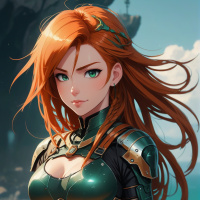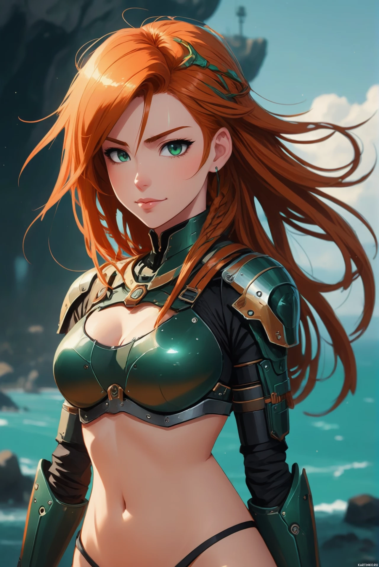 На картинке изображена рыжеволосая девушка в доспехах, стоящая на скале у океана. Кажется, она смотрит вдаль, на воду. Доспехи украшены сложным орнаментом, а нагрудник подчеркивает ее фигуру. Место действия навевает мысли о фэнтези или приключении.