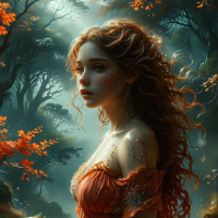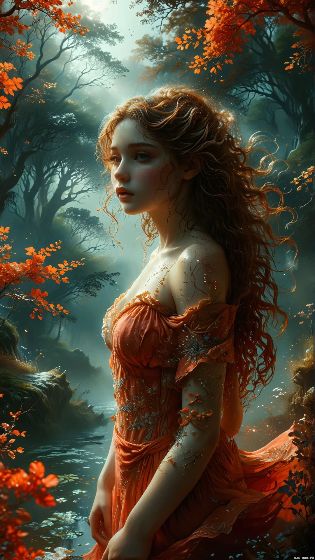 На картинке изображена молодая женщина с длинными волнистыми рыжими волосами. На ней платье в средневековом стиле, с замысловатым узором, словно из тончайшего материала, возможно, кружева или вышивки. У платья пышные рукава и завышенная талия, что характерно для моды эпохи Возрождения или схожих исторических периодов. Выражение лица женщины задумчивое, ее взгляд направлен в сторону, с легкой хмурой. Ее осанка изящна: одна рука покоится на бедре, другая свободно свисает. Задний план представляет собой фантастическую или сказочную сцену, доминируют осенние цвета: оранжевые и красные листья на деревьях, что указывает на наступление осени. Земля под ее ногами влажная и отражающая свет, что говорит о недавнем дожде и добавляет картинке неземной атмосферы. Освещение мягкое и рассеянное, подчеркивающее сказочность сцены.