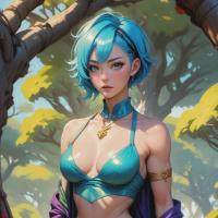 The image portrays a female character with blue hair. She has an elven-like appearance, featuring pointed ears and a youthful, somewhat naive expression. Her attire consists of a bodice top that suggests a fantasy setting, with ornate designs on it. The bottom half of her outfit is a pair of tight, shiny green leggings or pants. She wears gold jewelry, including braclets and an anklet, which adds to the fantastical nature of her look. The background suggests a natural environment with lush greenery, possibly a forest or a fairy tale setting. The lighting is soft and appears natural, suggesting that it might be daytime.