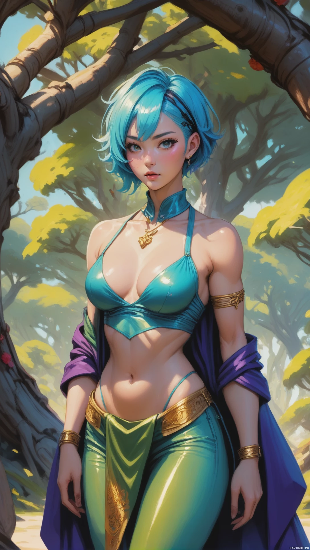 На картинке изображена девушка с синими волосами. У неё эльфийские черты лица, заострённые уши и юное, немного наивное выражение. На ней топ-боди, который явно указывает на фэнтезийный сеттинг, с замысловатыми узорами. Нижняя часть наряда – облегающие, блестящие зелёные леггинсы или брюки. Она носит золотые украшения, включая браслеты и носки, что добавляет сказочности её облику. Фон намекает на природную среду с пышной зеленью, возможно, лес или декорации для сказки. Освещение мягкое и естественное, что говорит о дневном времени суток.