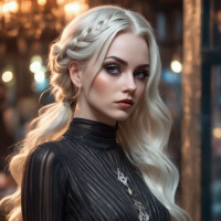 На картинке изображена женщина с светлыми волосами, заплетенными в косы, зачесанными набок. У нее выразительные брови, тени и темная помада, гармонирующая с ее тоном кожи. На ней черный комбинезон с высоким воротником, украшенный деталями, ткань которого кажется сетчатой. На ее лице серьезное выражение, взгляд направлен прямо в камеру. Одна рука приподнята возле рта, а на щеках легкий румянец. Фон указывает на интерьер с деревянной обшивкой и, кажется, частью предмета мебели на переднем плане.