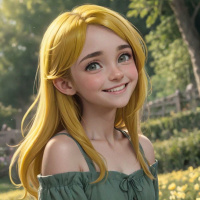 The image features a young woman with blonde hair styled in loose waves that cascade down her shoulders. Her smile reveals a set of straight white teeth. She has rosy cheeks and is wearing makeup that accentuates her eyes, eyebrows, and lips. She is dressed in a green corset-style top with puffed sleeves and a ruffled collar. The top is adorned with an embroidered floral pattern at the neckline. Her hair falls loosely over her shoulders and is held back by what appears to be a pink or light red barrette, adding a touch of color contrast to her blonde hair. The background suggests a serene outdoor setting with greenery and flowers around her, possibly indicating a garden or park environment. There are trees in the background that suggest the area is well-maintained and likely not far from residential areas given the presence of a fence.