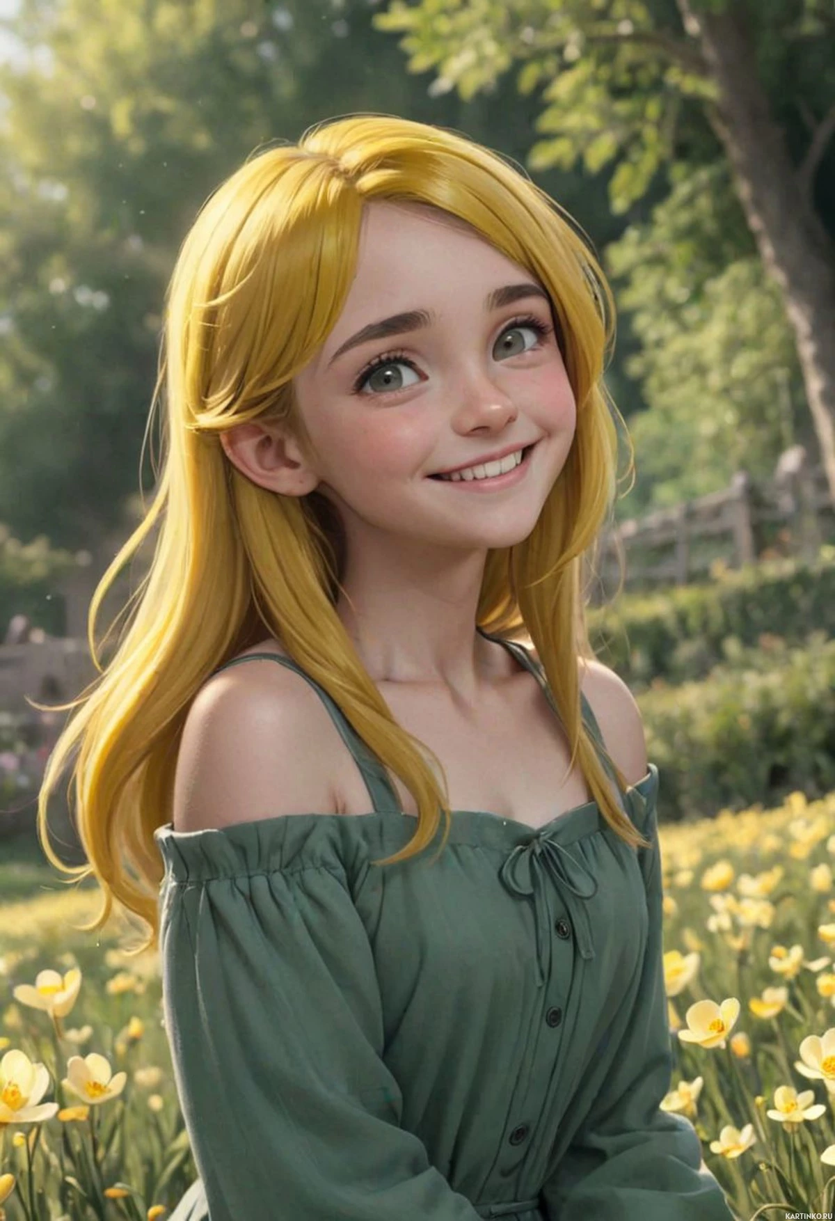 На картинке запечатлена молодая женщина с золотистыми волосами, волнами спадающими на плечи. Её улыбка демонстрирует ровные белые зубы. На щеках лёгкий румянец, а макияж подчеркивает глаза, брови и губы. Она одета в зелёный лиф в корсетном стиле с пышными рукавами и воротником в рюшах. Лиф украшен вышитыми цветами на шее. Волосы свободно ниспадают на плечи, и зафиксированы розовой или светло-красной заколкой, создающей цветовой контраст с её светлыми волосами. На заднем плане виднеется спокойная природа с зеленью и цветами, возможно, сад или парк. Фон составляют деревья, указывающие на ухоженную территорию, вероятно, недалеко от жилых домов, судя по наличию забора.
