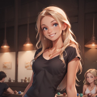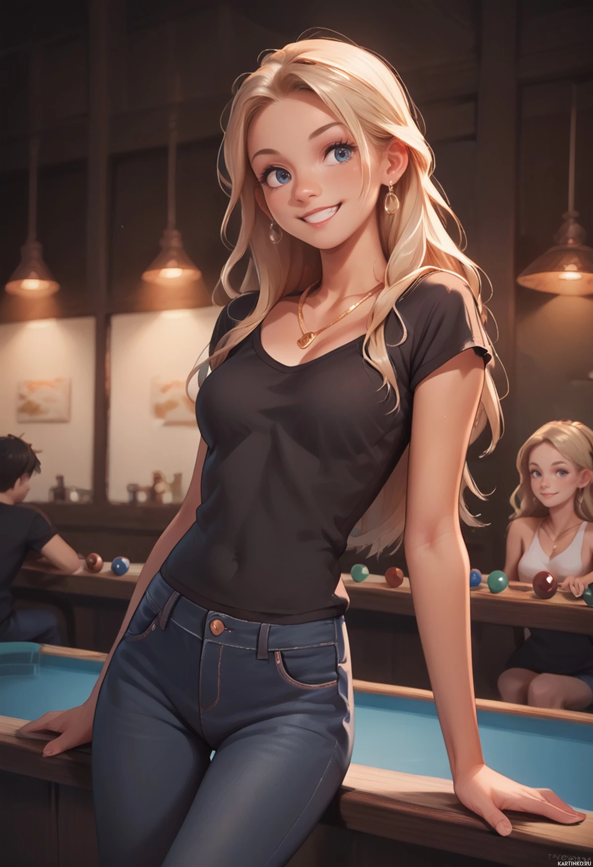 На картинке запечатлена девушка, вероятно, в возрасте от двадцати пяти до тридцати лет. У нее светлые волосы, и она улыбается в камеру. На ней черная майка с подвернутыми рукавами и темно-синие джинсы. На заднем плане барная стойка с различными предметами, включая, кажется, бильярдный стол. Там же видны другие люди, которые, похоже, общаются или чем-то заняты. Общий стиль картинки наводит на мысль, что она может быть из видеоигры или фильма, судя по качеству и стилизованным персонажам.