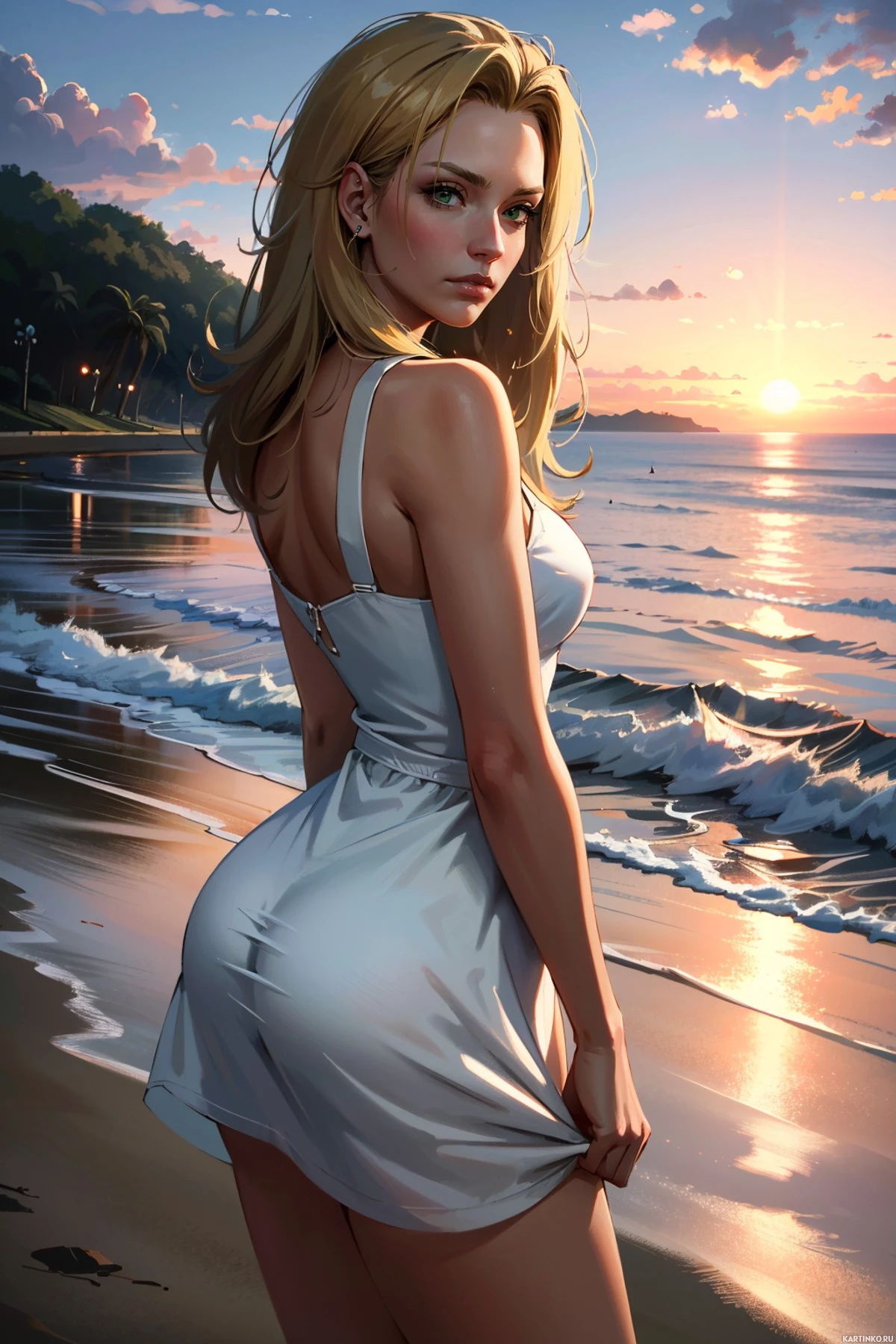 На картинке изображена фигура человека, стоящего на песчаном пляже во время восхода или заката – судя по теплому освещению, которое отбрасывает длинные тени и подчёркивает края облаков в небе. Человек стоит спиной к камере, глядя на воду, где солнце частично скрыто облаками. У него светлые волосы, ниспадающие на плечи, и он одет в платье без рукавов приталенного кроя, которое отражает свет, будто сделано из блестящей ткани. На пляже видны песок, растительность у кромки воды и горизонт, где небо сливается с водой. Общий стиль картинки – портрет на фоне пейзажа.