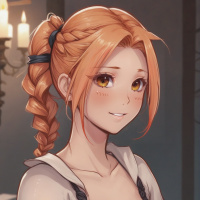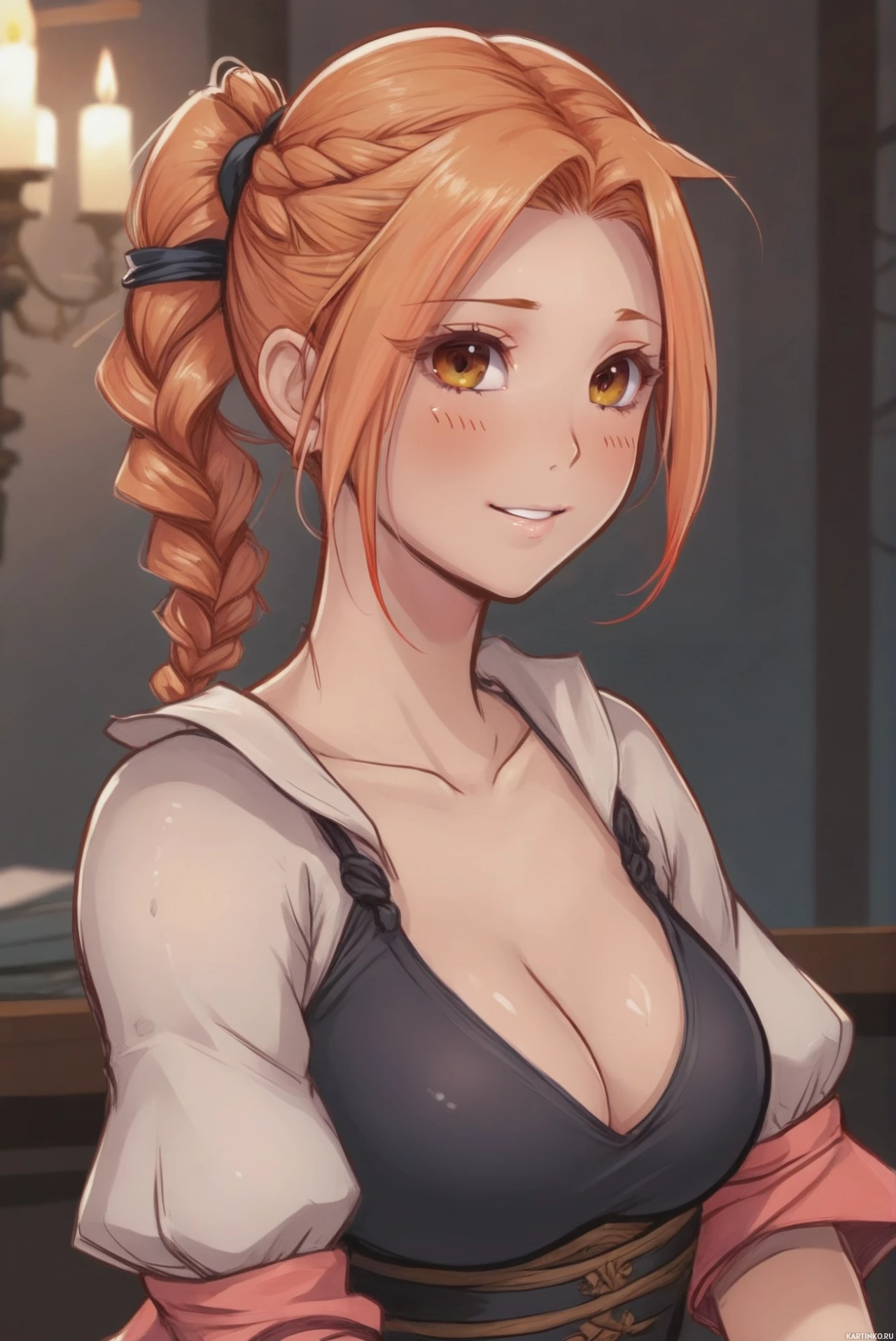 На картинке изображена молодая женщина с ярко-рыжими волосами, заплетенными в косы. У нее светлая кожа и макияж, подчеркивающий ее черты, особенно большие голубые глаза. Её губы слегка приоткрыты, обнажая зубы, что придает ей дружелюбное и гостеприимное выражение. На ней костюм, состоящий из юбки с высокой талией бежевого цвета с пуговицами спереди и кожаным корсетом – это создает ощущение стиля стимпанк или фэнтези. Ее левая рука лежит на поверхности перед ней, пальцы слегка касаются дерева. Фон кажется тусклым, возможно, это указывает на внутреннее помещение, возможно, созданное для придания интимной атмосферы.
