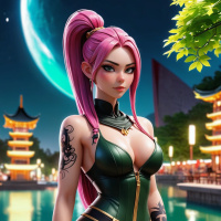 На картинке изображена девушка с розовыми волосами, уложенными в пучок. У неё светлая кожа и макияж глаз с выразительными ресницами. На ней тёмно-зелёный боди с металлическими вставками, включая пояс или наколенник на талии. Она сидит на выступе, откуда открывается вид на ночной пейзаж: водная гладь отражает лунный свет, а на заднем плане видны здания под звёздным небом.