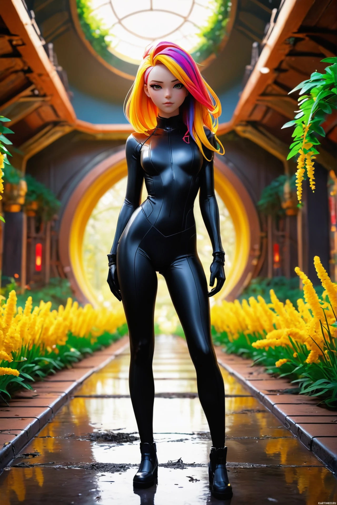 На картинке изображена женская персонажка в стиле трёхмерной графики, характерном для цифровой живописи. У неё яркие розовые и фиолетовые волосы, а тело, кажется, покрыто блестящей чёрной латекса или кожи. Персонаж стоит, одна рука опирается на бедро, другая касается земли. Выражение лица нейтральное. Она находится в архитектурной обстановке, на заднем плане виден большой арочный проём, через который проглядывает сад, полный жёлтых цветов. Освещение указывает на то, что это может быть день, а общая атмосфера картинки – сюрреалистичная, но при этом проработанная в деталях.