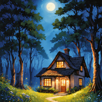 Картинка изображает сказочное ночное видение: на небе сияет полная луна. В центре – уютный домик с покатой крышей и трубой, из окон которого льется теплый желтый свет, намекая на обитаемых и душевных жильцов. Домик притаился среди высоких деревьев, силуэты которых четко выделяются на фоне ночного неба. Тропинка, словно вымощенная булыжником или гравием, ведет к крыльцу, маня войти. По обе стороны от нее высятся огромные, древние деревья с мощными стволами и ветвями, тянущимися к лунному свету. Картина наполнена покоем и вызывает ощущение волшебной реальности.