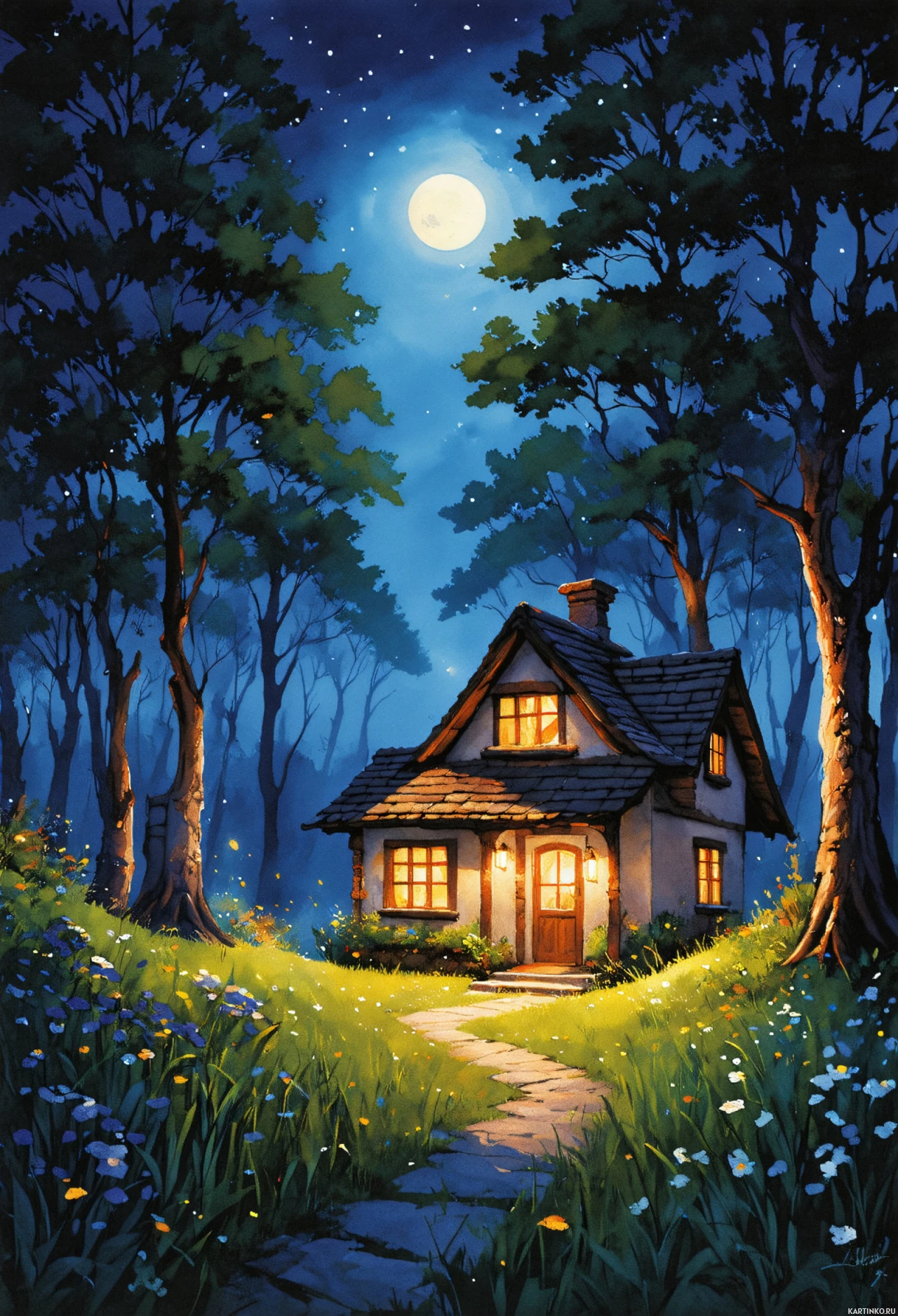 The image depicts a fairytale-like setting at night with a full moon illuminating the sky above. At the center of the scene is a quaint cottage with a pitched roof and a chimney, featuring warm yellow light emanating from its windows, suggesting it's occupied and cozy inside. The cottage is nestled among tall trees that are silhouetted against the night sky. A path, possibly made of cobblestone or gravel, leads up to the front door of the house, inviting one in. On either side of this path stand large, ancient-looking trees with thick trunks and branches reaching out towards the moonlight. The scene is serene, evoking a sense of tranquility and magical realism.