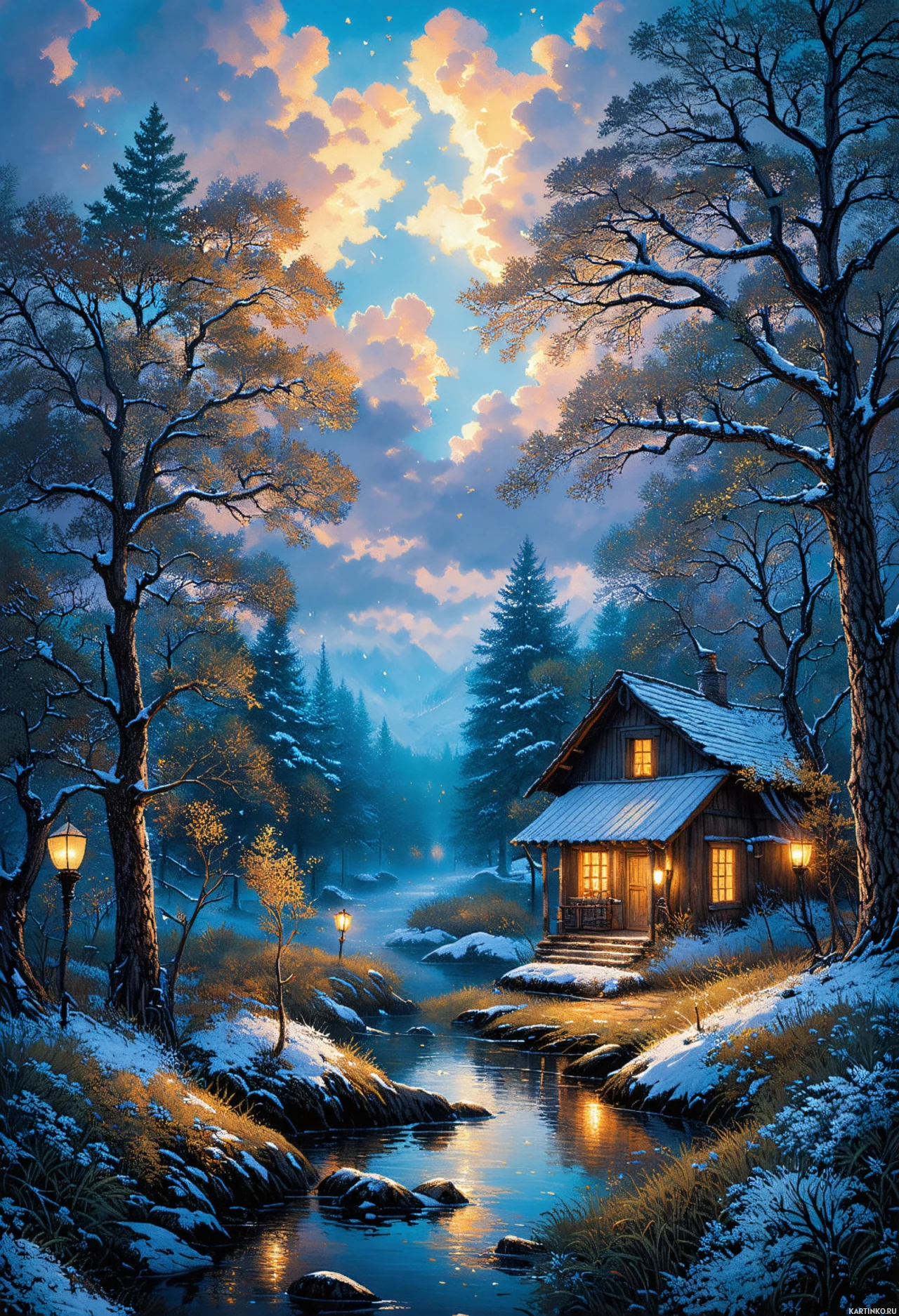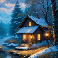 The image depicts a tranquil winter scene with a cabin nestled among evergreen trees, snow covering the ground and roof of the cabin, and a gentle stream flowing through. The sky is partially cloudy, suggesting early evening or nighttime given the soft glow of twinkling stars above.