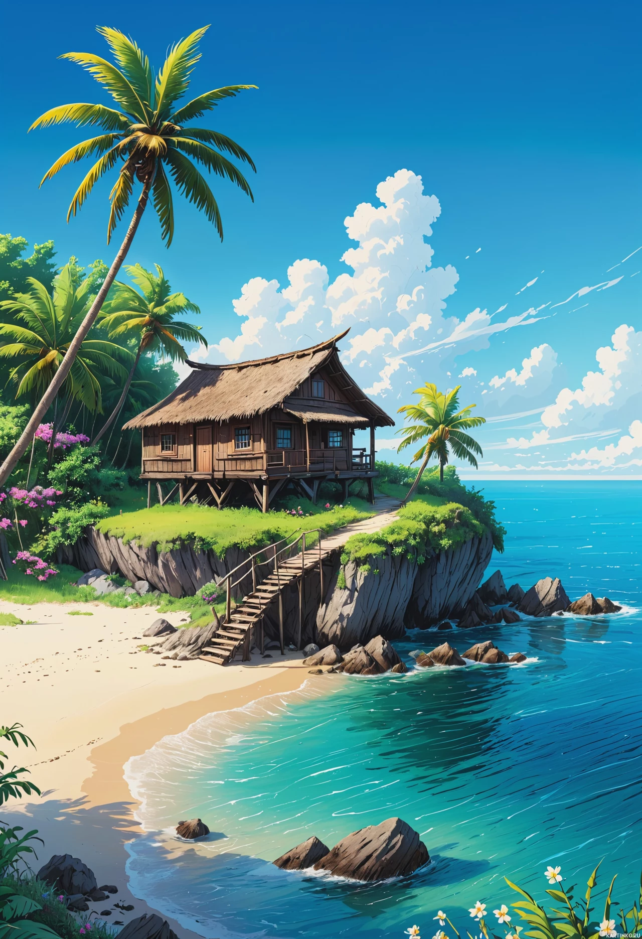 На картинке изображен безмятежный тропический пейзаж. Видна хижина с соломенной крышей на сваях, расположенная на пляже и обращенная к океану. Перед хижиной – каменная лестница, ведущая к самой воде. Слева в переднем плане возвышается пальма, а справа – еще несколько пальм вдоль береговой линии. Небо частично облачное, сквозь тучи виден солнце, создавая светлую и радостную атмосферу. Океан выглядит спокойным и манящим, с легкими волнами, ласково накатывающими на берег.
