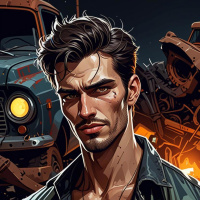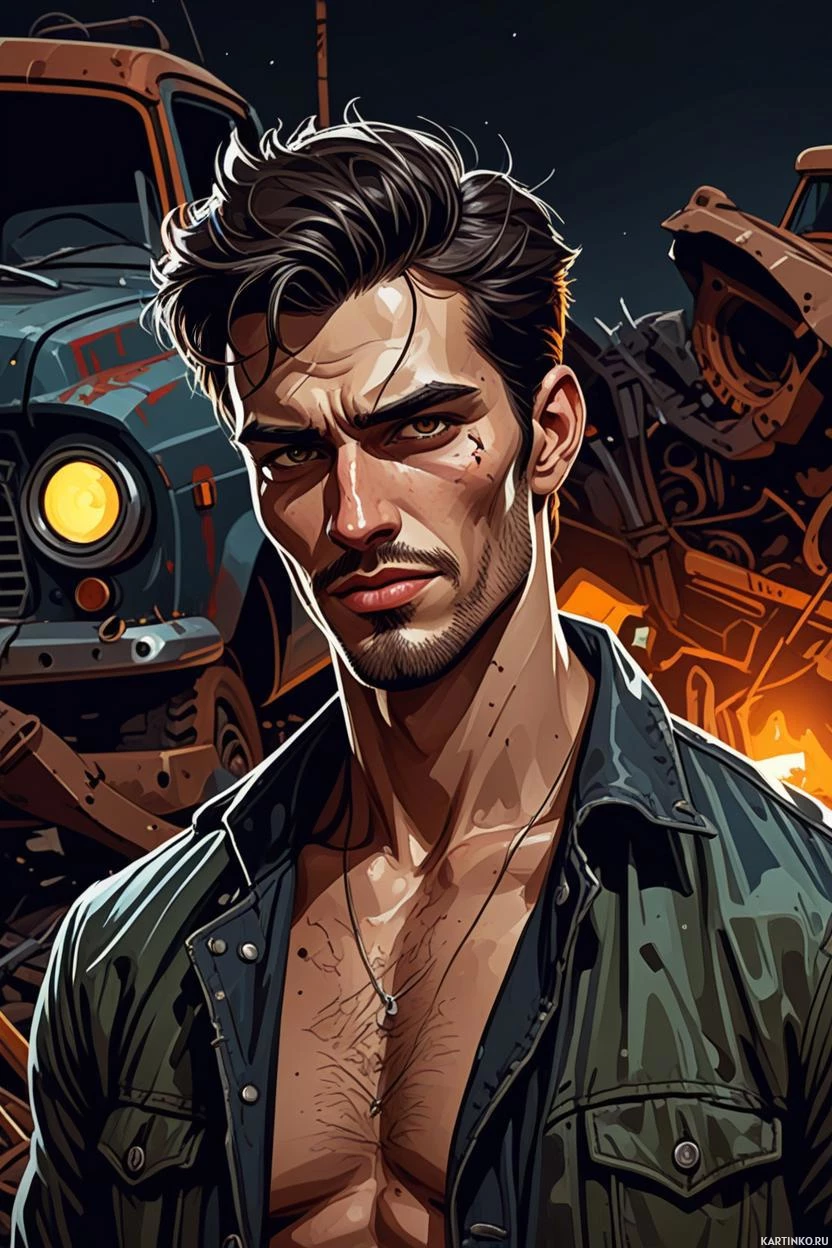 На картинке выделен мужчина с длинными волосами и бородой. На нем майка, подчеркивающая его мускулатуру. Выражение лица серьезное или напряженное. На заднем плане – два старинных грузовика, за которыми словно бушует пламя, создавая ощущение динамики и конфликта. Освещение придает картинке драматический эффект.