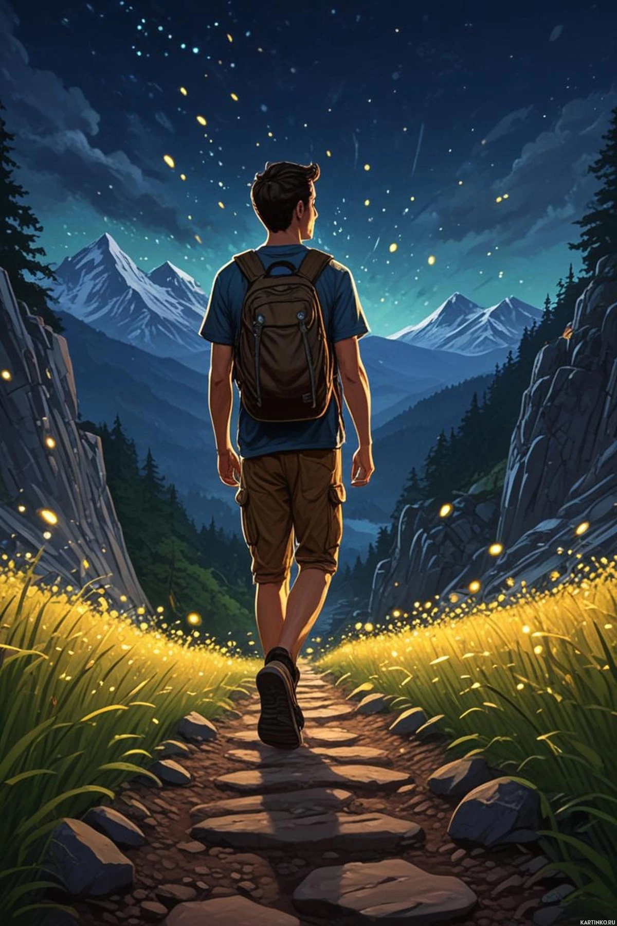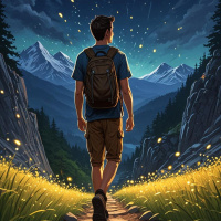 На картинке мужчина уходит от зрителя в сторону живописного горного пейзажа, словно на рассвете или закате, судя по теплому освещению. На нём рюкзак, и похоже, он идёт в поход. Он смотрит вдаль. Вокруг него мерцают маленькие искорки света, создавая ощущение волшебства.