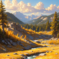 На картинке изобран безмятежный альпийский пейзаж, залитый теплыми красками, словно на рассвете или закате. На переднем плане – чистый ручей, журчащий среди лугов, с несколькими крупными камнями по берегам. Справа от ручья виднеется пышный луг, усеянный деревьями. На заднем плане возвышаются величественные горы, на фоне неба с редкими облаками. Вершины гор покрыты снегом, что позволяет предположить, что фотография была сделана весной или в начале лета. Среди лугов и камней растут зеленые ели. В целом сцена очень спокойная и идиллическая, запечатлевшая природную красоту высокогорного ландшафта. Освещение говорит о том, что, возможно, был пасмурный день, ведь на пейзаже нет резких теней или ярких бликов.