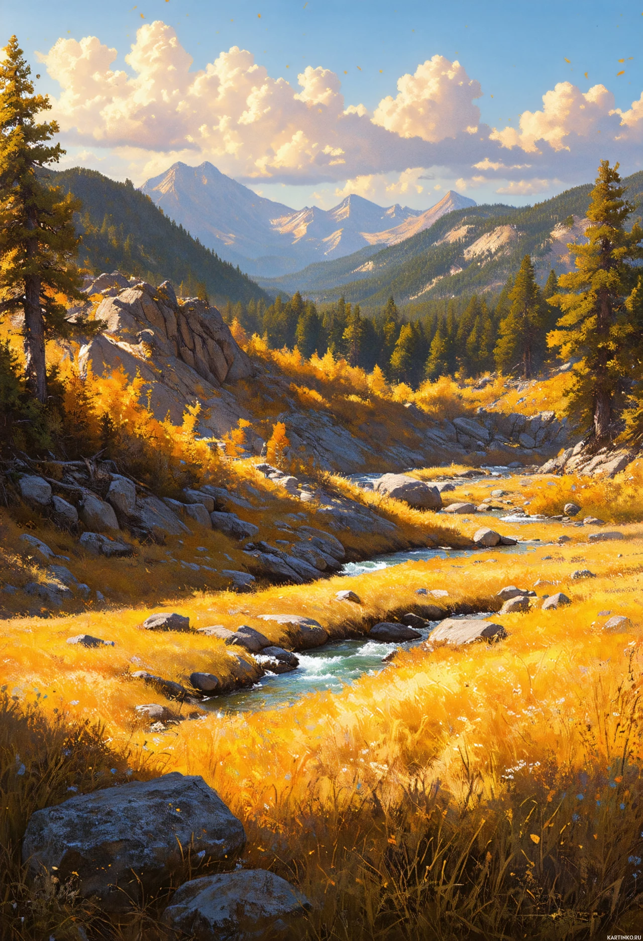 The image depicts a serene alpine landscape during what appears to be either sunrise or sunset, given the warm colors and soft lighting. In the foreground, there's a clear stream flowing through grassland, with a few large rocks along its banks. On the right side of the stream, a lush meadow is visible with a scattering of trees. In the background, majestic mountains rise against a sky with a few scattered clouds. The mountains have snow-capped peaks, suggesting it could be spring or early summer when this photo was taken. There are also green pine trees interspersed among the grassy meadow and rocks. The overall scene is peaceful and idyllic, capturing the natural beauty of a high alpine environment. The lighting suggests that it might be an overcast day, as there are no harsh shadows or bright highlights on the landscape.