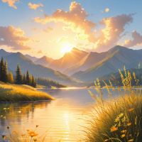 Картинка запечатлела безмятежный пейзаж на рассвете. Спокойная водная гладь отражает оттенки неба, берег окаймлён деревьями, а вдалеке виднеются горы. Солнце частично скрыто облаками, окутывая всю сцену тёплым светом. На лужайке у самой воды разбросаны цветы и растения.