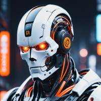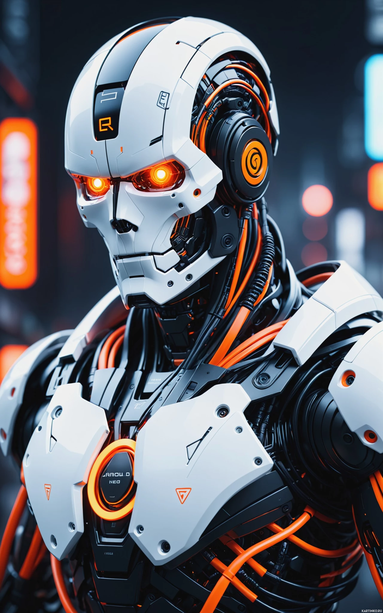 На картинке изображён гуманоидный робот с продвинутым, элегантным дизайном. У него сложная голова с множеством механических компонентов и проводки, придающих ему кибернетический вид. Кожа робота преимущественно белая, с видимыми металлическими конструкциями и оранжечными схемами. На груди – красные светящиеся элементы, а также, похоже, электронное сердце. Глаза светятся красным, а на голове – дополнительные выступы, напоминающие датчики. Фон указывает на сеттинг, который может быть частью научно-фантастического сюжета, возможно, связанного с технологиями или футуристическими темами.