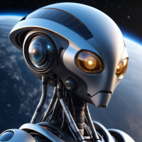 The image depicts a humanoid robot standing in space with a view of Earth in the background. The robot has a metallic body with visible mechanical components such as pipes, wires, and what appears to be a head with glowing eyes. The design suggests advanced technology, commonly associated with science fiction themes and robots. The color palette is cool tones dominated by grays and blues, which contrast with the warm hues of Earth below.