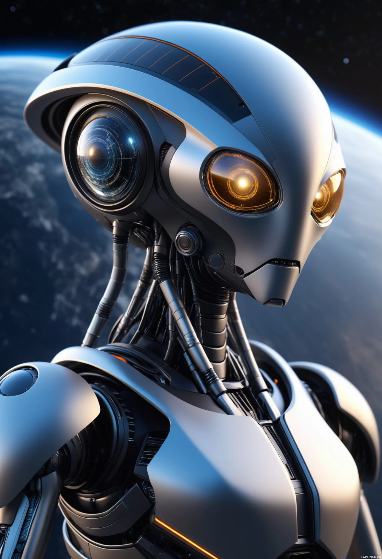 На картинке изображен гуманоидный робот, стоящий в космосе на фоне Земли. У робота металлический корпус с видимыми механическими элементами: трубами, проводами и, судя по всему, головой с горящими глазами. Дизайн указывает на передовые технологии, характерные для научно-фантастической тематики и робототехники. Цветовая гамма выполнена в холодных тонах, преобладают серые и синие оттенки, которые контрастируют с теплыми красками Земли внизу.