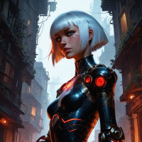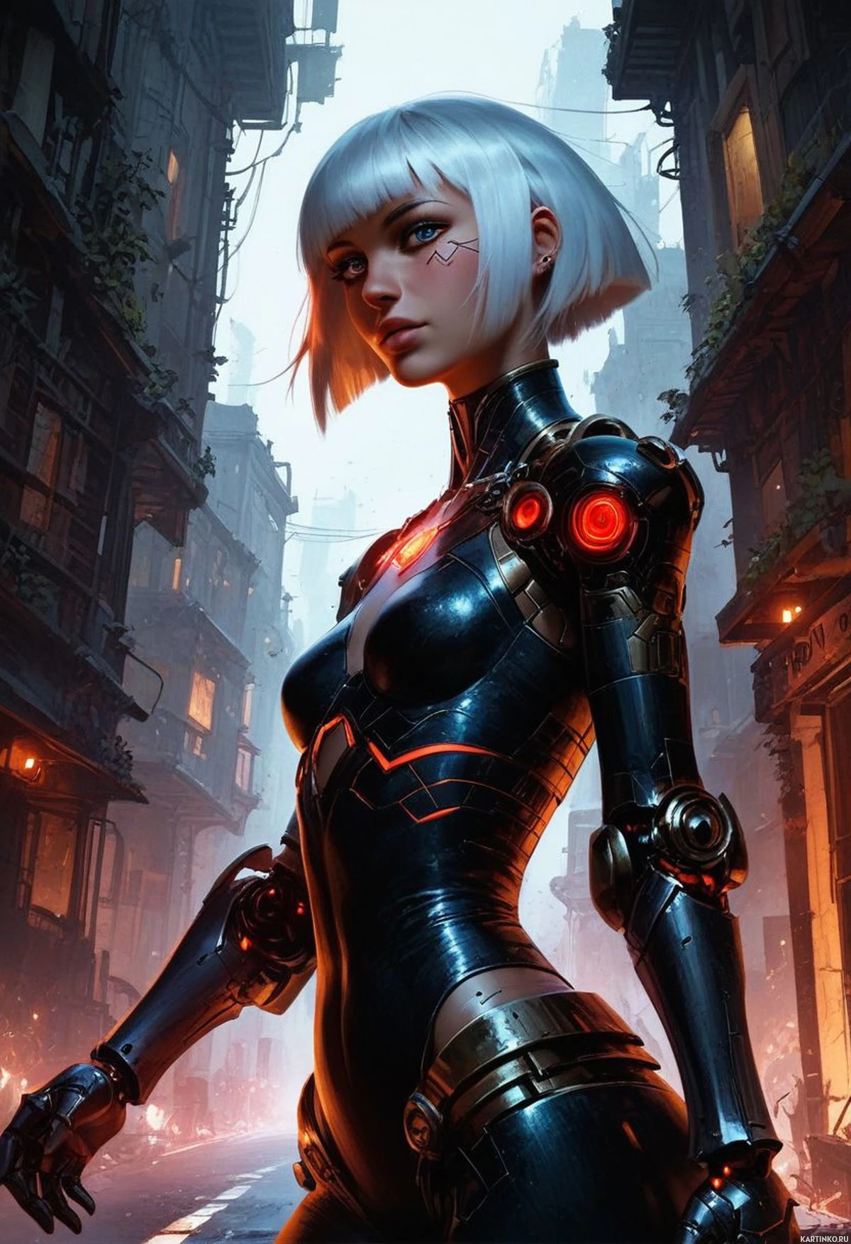 На картинке изображена девушка с белыми волосами в футуристическом или научно-фантастическом сеттинге. На ней обтягивающий, стильный доспех, сочетающий в себе механические и органические элементы, что указывает на высокий уровень технологической интеграции в её дизайн. Её наряд включает боди с глубоким вырезом, что добавляет образу футуристичности. Девушка стоит в том, что похоже на переулок или узкую улицу, окруженная разрушающимися строениями и винтажной эстетикой, контрастирующей с передовым доспехом. Окружение создает ощущение городской среды, но также намекает на упадок и, возможно, антиутопическое будущее.
