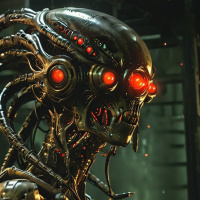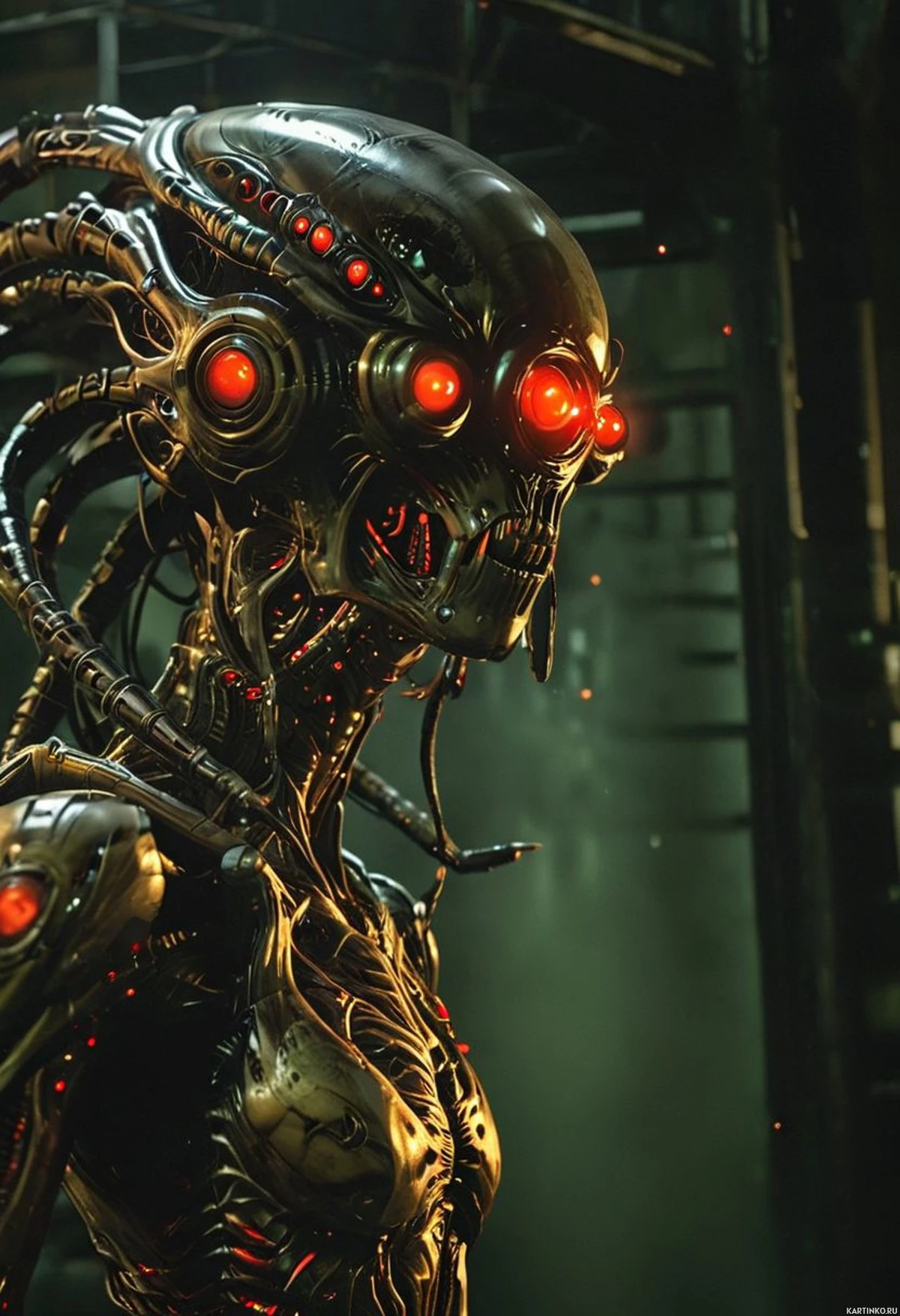 На картинке изображен персонаж, похожий на инопланетянина, в научно-фантастическом сеттинге. Существо имеет гуманоидную форму, с двумя ярко светящимися красными глазами, металлической кожей или броней, и множеством механических или органических наростов, выступающих из плеч и головы. Он стоит в тускло освещенном промышленном помещении, возможно, на фабрике или в лаборатории, на заднем плане видны трубы и механизмы. Внешний вид персонажа внушает страх, подразумевая, что это может быть некое роботизированное или кибернетически усовершенствованное существо.